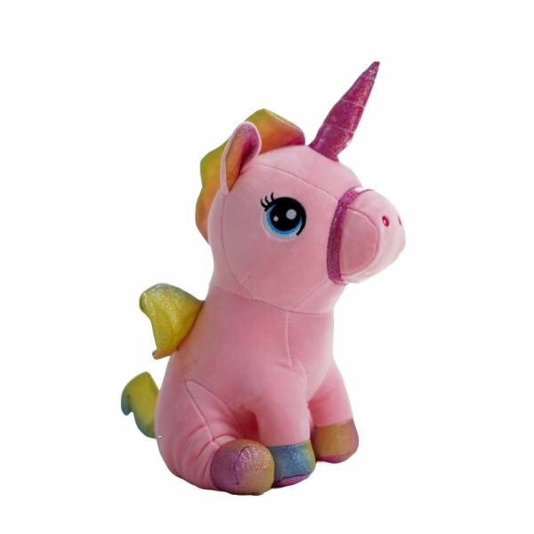 Peluche suave de unicornio rosa con detalles brillantes