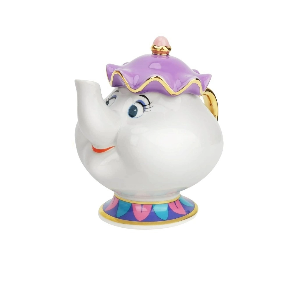 Esta tetera de cerámica estilo Sra. Potts es una pieza decorativa y funcional que destaca por sus terminaciones brillantes, detalles dorados y su diseño inspirado en personajes animados muy queridos. Su forma redondeada, tapa con acabado color lavanda y expresiones amigables la convierten en un objeto perfecto para coleccionistas, fans de la animación y quienes buscan un regalo original.